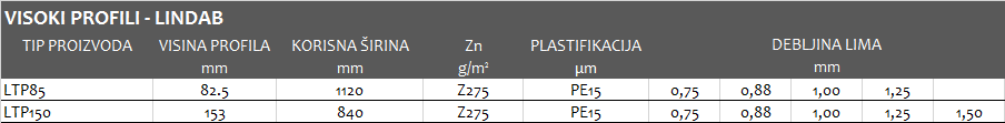 Visokoprofilizovani trapezni limovi Lindab se proizvode od čelika vrhunskog kvaliteta, pocinkovanost je 275 g/m2, a završni površinski sloj za unutrašnju upotrebu je plastifikacija od 15µm PE15. Garancija na visokoprofilizovane limove Lindab LTP 15 godina.